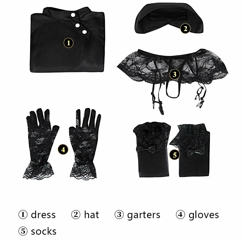 Included: Dress, hat, garter, gloves, socks.