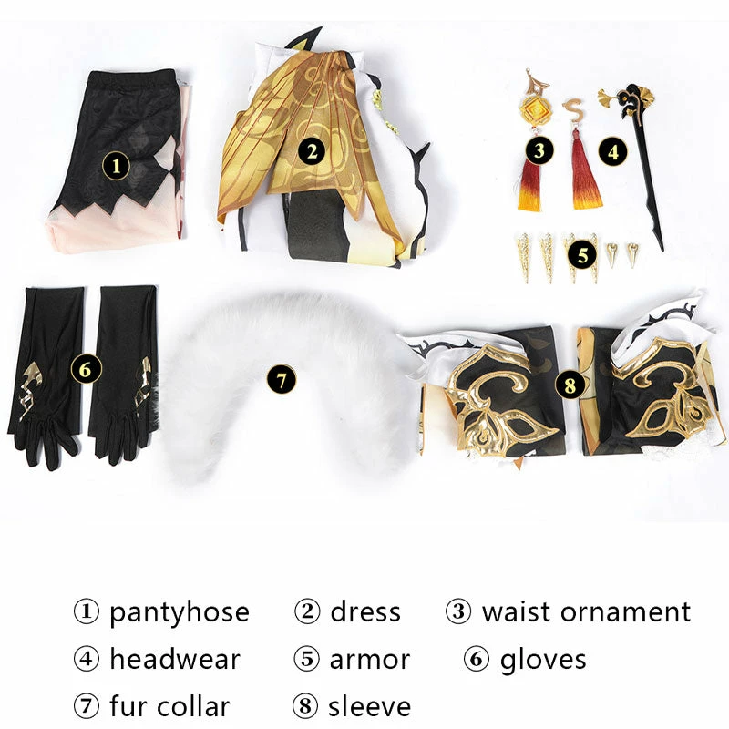 Included: Tights, skirts, waist accessories, hair accessories, armor, gloves, fur collars, sleeves